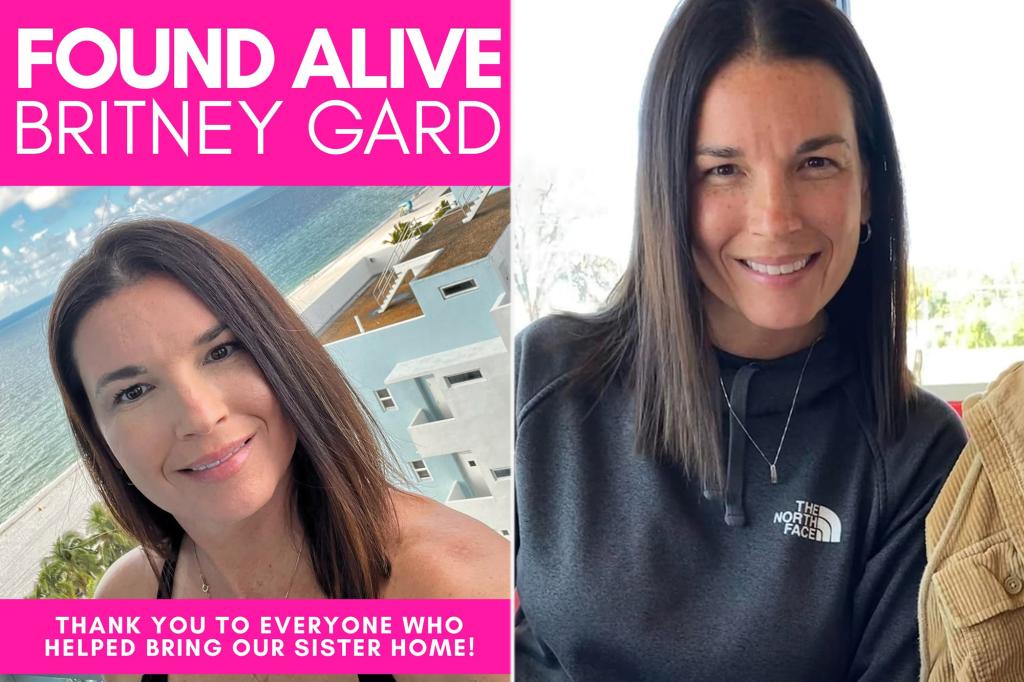 Britney Gard, 46, had been missing for eight days before she was found alive on Wednesday and taken to a hospital.